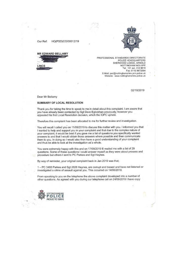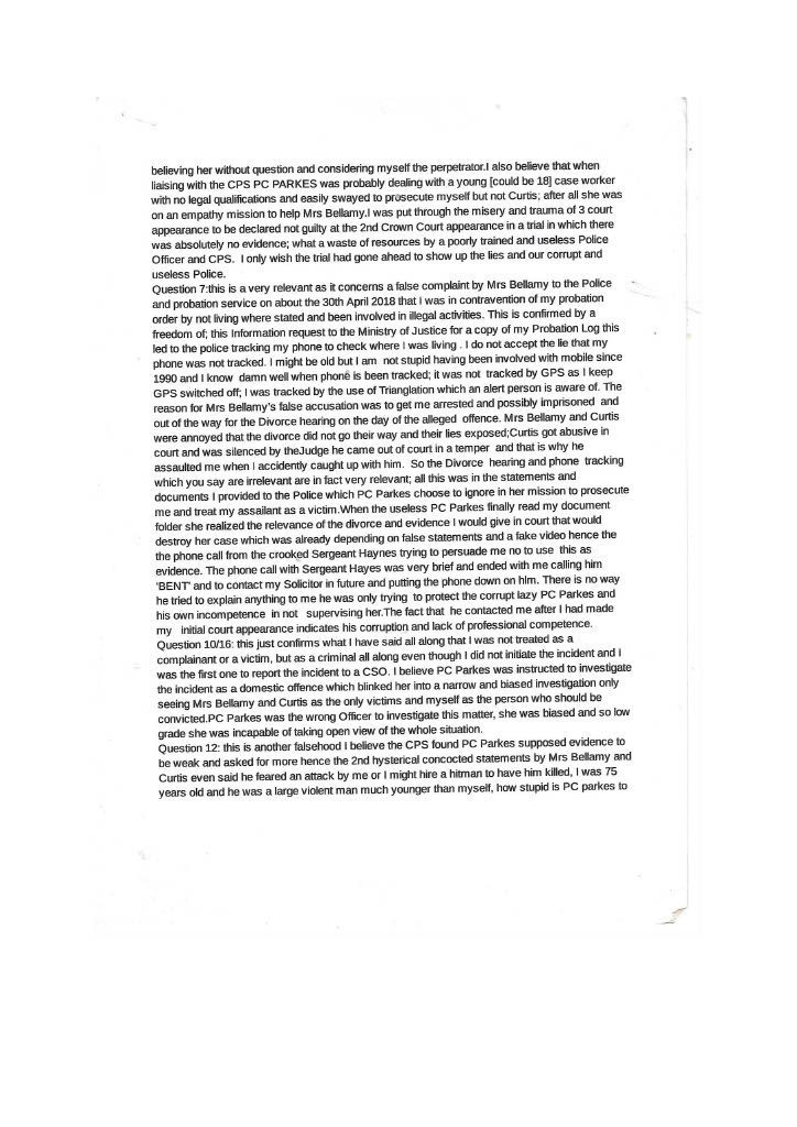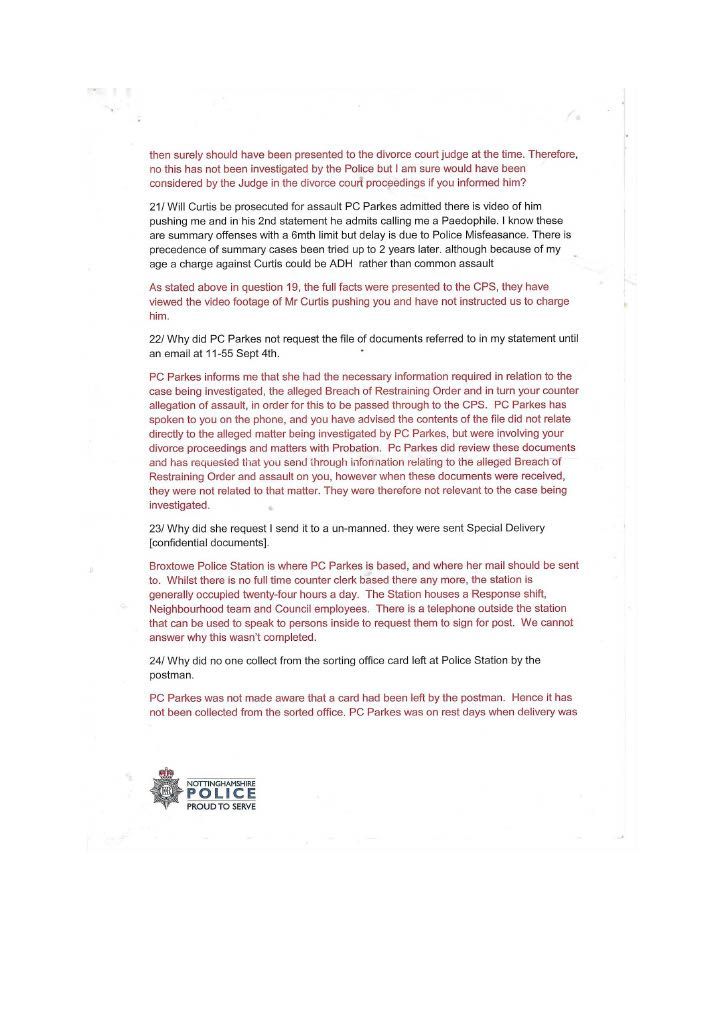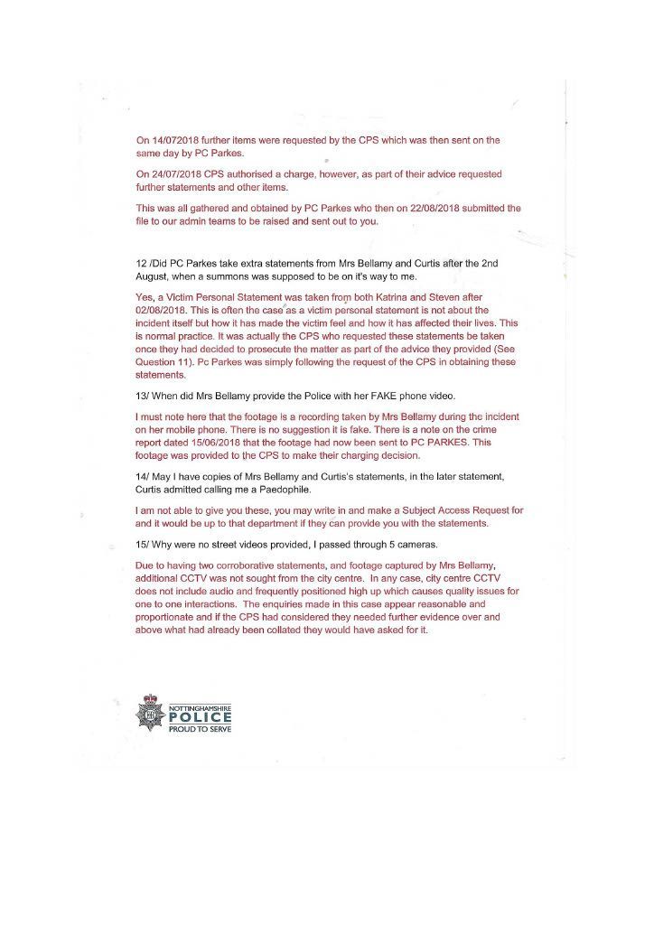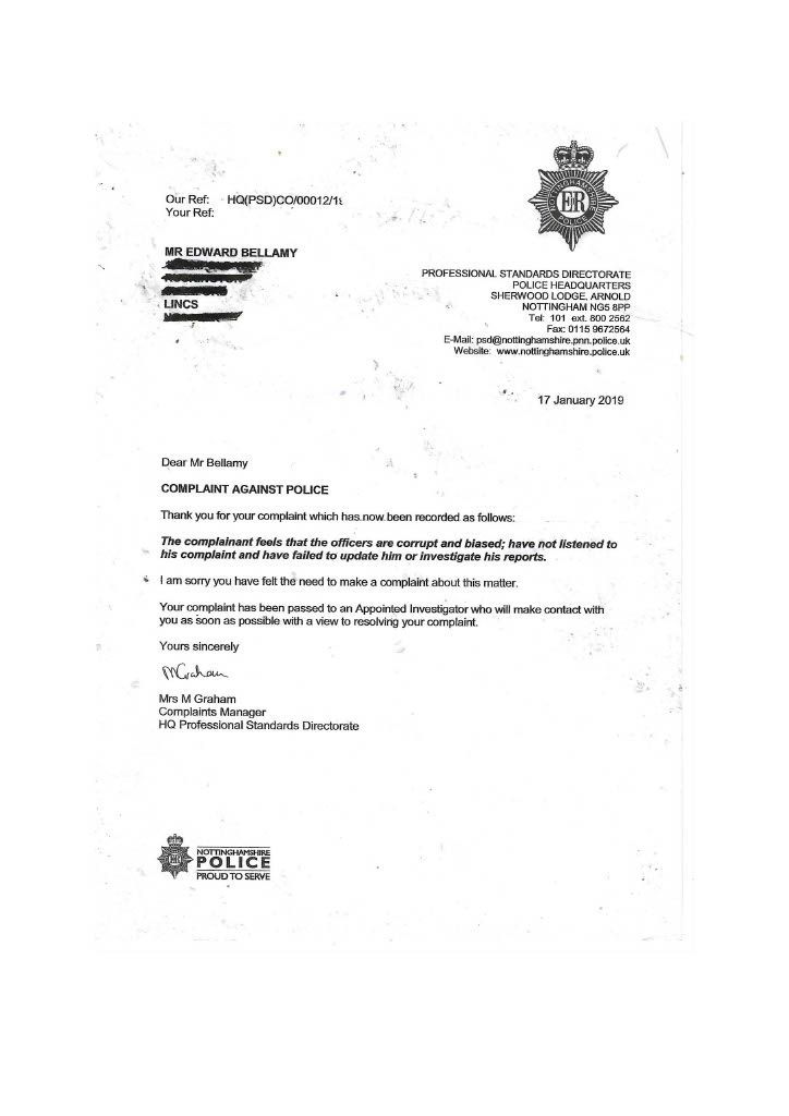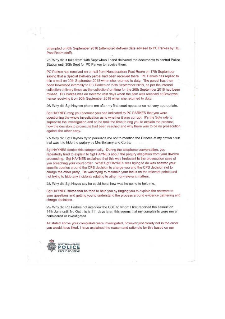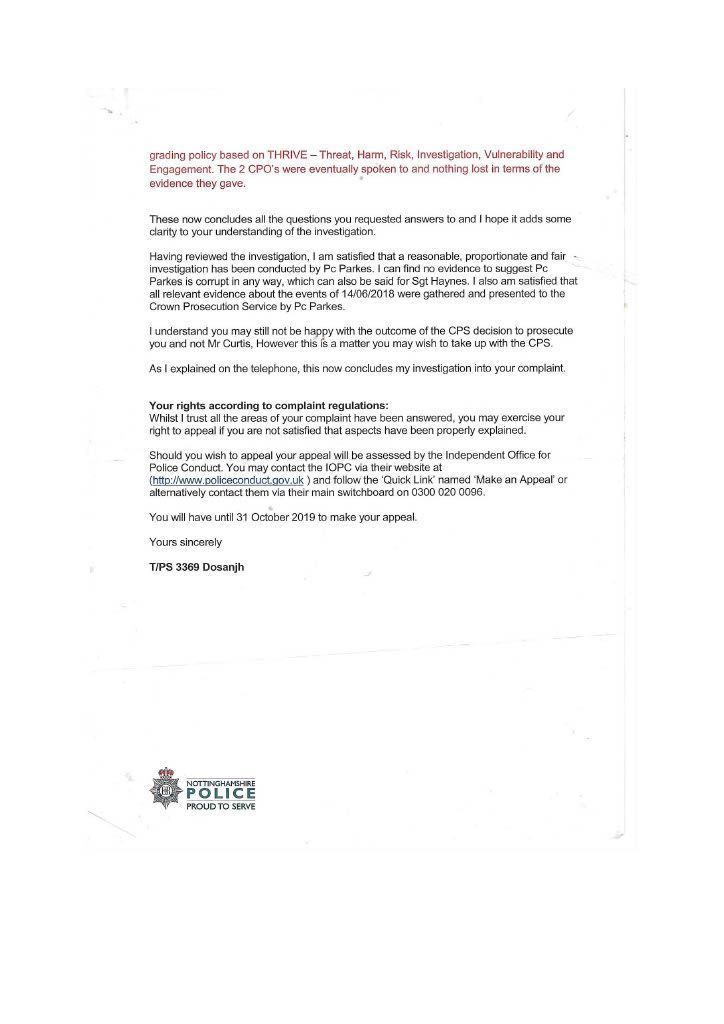 PC Parkes constantly did not contact me refused to interview me, and ignored my offer to supply supporting documents. It was only after. I had emailed the divisional commander that I got in contact with Parkes to inform me that CPS would issue a summons, this was a lie; the Police issue the summons the CPS only review the evidence first. I then realised she had not investigated the assault on myself in her evil twisted mind, I was the guilty person and she had no intention of carrying out a proper investigation, as she had promised Mrs Bellamy to get me convicted. PC Parkes obviously did not agree with when Lord Denning stated that: “IN THE EXERCISE OF THEIR POWERS THE POLICE ARE ANSWERABLE TO THE LAW AND THE LAW ALONE.” PC Parkes answered to her own law and prejudices’. On the 3rd of September, I sent a special delivery letter to Nottinghamshire Police Standards complaining about the lack of action on my complaint of being assaulted by Curtis day and the following day; they telephoned to tell me to submit a complaint of the assault online, so had not have got my original complaint logged on their system although me been given a card with an incident number on the day of the assault. I then submitted an online complaint. PC Parkes emailed me the same day, stating that there was footage showing my interaction with Curtis and Mrs Bellamy and Curtis pushing me and said the CPS had charged me and would receive a summons through the Post. THIS WAS A COMPLETE LIE; the police decide to prosecute and issue the summons. The CPS only advises and conducts cases in court. She finished by saying her sergeant would contact me when he was back in a weeks' time why was this necessary when the CPS was supposed to be handling it. She knew she was wrong, so the sergeant phoned me to get me to alter my evidence, which struck me as corrupt as Parkes. When I attended the Magistrates on the 26th of September, I saw the phone video for the first time; it was so obviously fake it was laughable. A ten-year-old would have spotted that I was fake, and there was no image of me being pushed or saying anything; it just showed my back and me walking away. There was loud, hysterical shouting from Mrs Bellamy, purporting to be what I had said, but I had said nothing; Curtis had been shouting; this was deleted, and Mrs Bellamy’s rant superimposed later> I asked for this for the video to be forensically examined and footage from five street cameras in the area. At the 2nd case management hearing, the Crown Court the case failed, and the CPS offered no evidence, stating there was no CCTV footage available, a blatant lie as the street camera footage would show the truth. I do not know enough words to describe PC Parkes; she is not Human; she is lower than any other form of life and should not be a member of our society. People like her will destroy society and our way of life, increasing distrust in our already distrusted Police. This woman is as wicked and evil as the worst male officer, and I class her as a NAZI who is completely indoctrinated in what I explained earlier. she attempted to get me convicted of a crime I did not commit which carries a maximum sentence of five years. I believe Parkes should have been tried for malfeasance in Public Office, which has a maximum life sentence; this should apply to many Police officers. However, the corrupt regime seems reluctant to use it, maybe to many senior police would end up in prison. More about the cameras in my Crown Court story. When the Trial ended, I sent an online complaint to Nottinghamshire Police Standards see content below My complaint is against Nottinghamshire Police and in particular, PC 3468 Parkes and her supervising Sergeant {name not Known} for malfeasance in public office when acting as a Polics Officer wilfully neglected to perform her duty and/or wilfully misconducted herself. PC Parkes did not investigate my complaint or willingly contact me but took a one-sided attitude to the incident. I believe PC Parkes to be lazy, incapable, and possibly corrupt. Her sergeant is just as culpable because of her lack of supervision and oversight, and she telephoned after my first court appearance to persuade me to alter my statement. He told me he did not want to help me but to help PC Parkes and himself. I told him that he was bent. [sorry for using the vernacular] and to contact me through my Solicitor; he then put the phone down. You must have a large amount of paperwork on this already, I can, but I can supply copies if required PC Parkes should have the A4 Ring Binder with copies of the Documents that are referred to in the Statement. You will see from the Timeline that PC Parkes never considered me a complainant but an offender, and though she had no evidence, she tried to construct a case. I believe Mrs Bellamy gave a sad, tearful story to PC Parkes, who was full of empathy and sympathy and promised to have me convicted and hopefully imprisoned. This attitude of PC Parkes is corrupt in the legal meaning of corruption by showing favour to a person. PC Parkes completely ignored me until she phoned me on August 2nd, she only phoned me after I had complained to a Senior Officer over lack of contact; see also my letter 24th August to professional standards, who telephoned me on the 3rd of September and advised me to submit a report of assault; I thought I had done this on the 14th June 2018 but had obviously been ignored by PC Parkes. I did submit two reports online, but they were not acknowledged. PC Parkes emailed me on 4th September to request the documents that I had been offering since June 2018; these were sent Special Delivery 7th September for delivery 10th September [see emails], but despite the royal mail loving a card to collect the package from Glaisdale sorting office, it was not collected, so it had to be returned to me and I hand delivered it to Central Police Station on 14th of September [see receipt] but it was not seen by PC Parkes until 3