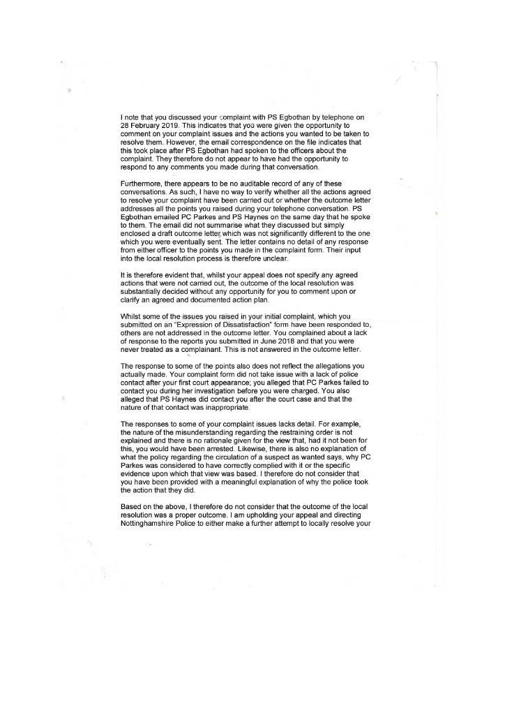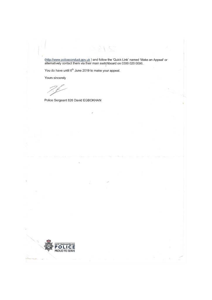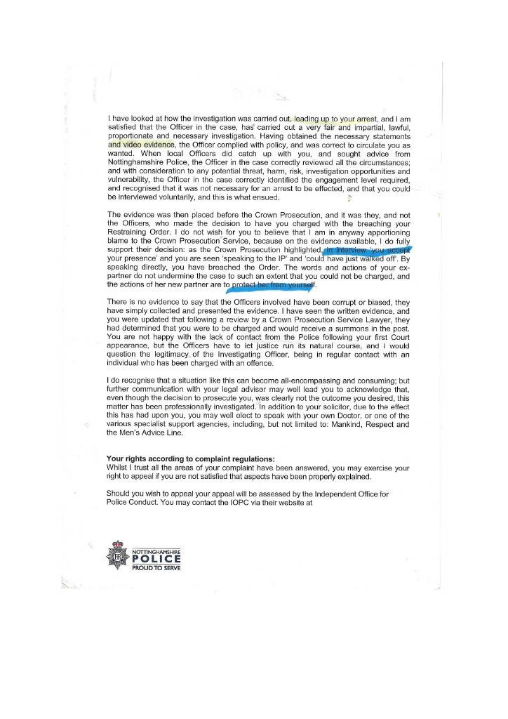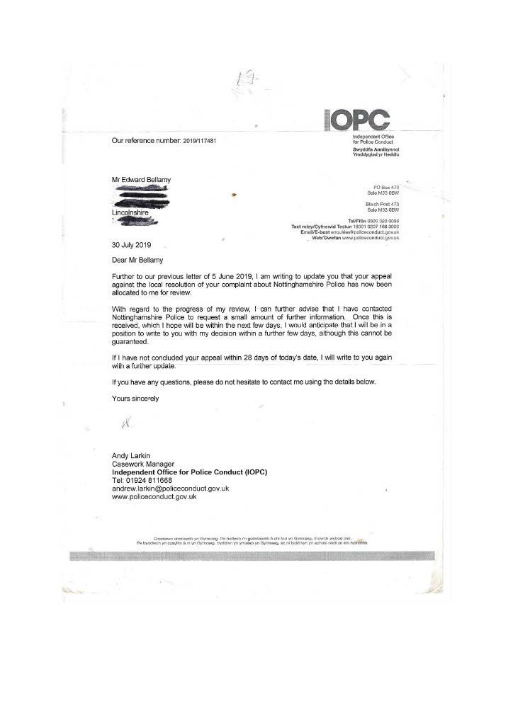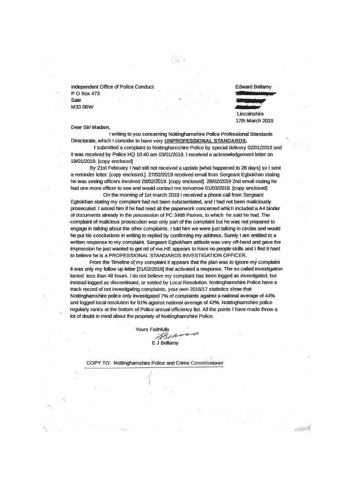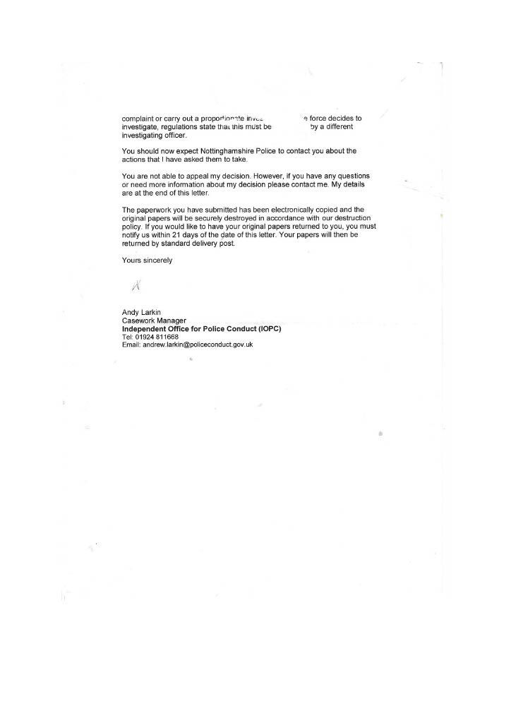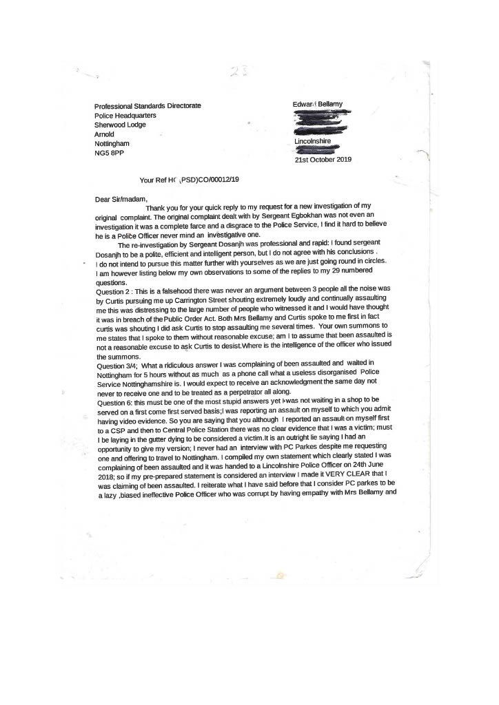 PC Parkes constantly did not contact me refused to interview me, and ignored my offer to supply supporting documents. It was only after. I had emailed the divisional commander that I got in contact with Parkes to inform me that CPS would issue a summons, this was a lie; the Police issue the summons the CPS only review the evidence first. I then realised she had not investigated the assault on myself in her evil twisted mind, I was the guilty person and she had no intention of carrying out a proper investigation, as she had promised Mrs Bellamy to get me convicted. PC Parkes obviously did not agree with when Lord Denning stated that: “IN THE EXERCISE OF THEIR POWERS THE POLICE ARE ANSWERABLE TO THE LAW AND THE LAW ALONE.” PC Parkes answered to her own law and prejudices’. On the 3rd of September, I sent a special delivery letter to Nottinghamshire Police Standards complaining about the lack of action on my complaint of being assaulted by Curtis day and the following day; they telephoned to tell me to submit a complaint of the assault online, so had not have got my original complaint logged on their system although me been given a card with an incident number on the day of the assault. I then submitted an online complaint. PC Parkes emailed me the same day, stating that there was footage showing my interaction with Curtis and Mrs Bellamy and Curtis pushing me and said the CPS had charged me and would receive a summons through the Post. THIS WAS A COMPLETE LIE; the police decide to prosecute and issue the summons. The CPS only advises and conducts cases in court. She finished by saying her sergeant would contact me when he was back in a weeks' time why was this necessary when the CPS was supposed to be handling it. She knew she was wrong, so the sergeant phoned me to get me to alter my evidence, which struck me as corrupt as Parkes. When I attended the Magistrates on the 26th of September, I saw the phone video for the first time; it was so obviously fake it was laughable. A ten-year-old would have spotted that I was fake, and there was no image of me being pushed or saying anything; it just showed my back and me walking away. There was loud, hysterical shouting from Mrs Bellamy, purporting to be what I had said, but I had said nothing; Curtis had been shouting; this was deleted, and Mrs Bellamy’s rant superimposed later> I asked for this for the video to be forensically examined and footage from five street cameras in the area. At the 2nd case management hearing, the Crown Court the case failed, and the CPS offered no evidence, stating there was no CCTV footage available, a blatant lie as the street camera footage would show the truth. I do not know enough words to describe PC Parkes; she is not Human; she is lower than any other form of life and should not be a member of our society. People like her will destroy society and our way of life, increasing distrust in our already distrusted Police. This woman is as wicked and evil as the worst male officer, and I class her as a NAZI who is completely indoctrinated in what I explained earlier. she attempted to get me convicted of a crime I did not commit which carries a maximum sentence of five years. I believe Parkes should have been tried for malfeasance in Public Office, which has a maximum life sentence; this should apply to many Police officers. However, the corrupt regime seems reluctant to use it, maybe to many senior police would end up in prison. More about the cameras in my Crown Court story. When the Trial ended, I sent an online complaint to Nottinghamshire Police Standards see content below My complaint is against Nottinghamshire Police and in particular, PC 3468 Parkes and her supervising Sergeant {name not Known} for malfeasance in public office when acting as a Polics Officer wilfully neglected to perform her duty and/or wilfully misconducted herself. PC Parkes did not investigate my complaint or willingly contact me but took a one-sided attitude to the incident. I believe PC Parkes to be lazy, incapable, and possibly corrupt. Her sergeant is just as culpable because of her lack of supervision and oversight, and she telephoned after my first court appearance to persuade me to alter my statement. He told me he did not want to help me but to help PC Parkes and himself. I told him that he was bent. [sorry for using the vernacular] and to contact me through my Solicitor; he then put the phone down. You must have a large amount of paperwork on this already, I can, but I can supply copies if required PC Parkes should have the A4 Ring Binder with copies of the Documents that are referred to in the Statement. You will see from the Timeline that PC Parkes never considered me a complainant but an offender, and though she had no evidence, she tried to construct a case. I believe Mrs Bellamy gave a sad, tearful story to PC Parkes, who was full of empathy and sympathy and promised to have me convicted and hopefully imprisoned. This attitude of PC Parkes is corrupt in the legal meaning of corruption by showing favour to a person. PC Parkes completely ignored me until she phoned me on August 2nd, she only phoned me after I had complained to a Senior Officer over lack of contact; see also my letter 24th August to professional standards, who telephoned me on the 3rd of September and advised me to submit a report of assault; I thought I had done this on the 14th June 2018 but had obviously been ignored by PC Parkes. I did submit two reports online, but they were not acknowledged. PC Parkes emailed me on 4th September to request the documents that I had been offering since June 2018; these were sent Special Delivery 7th September for delivery 10th September [see emails], but despite the royal mail loving a card to collect the package from Glaisdale sorting office, it was not collected, so it had to be returned to me and I hand delivered it to Central Police Station on 14th of September [see receipt] but it was not seen by PC Parkes until 3