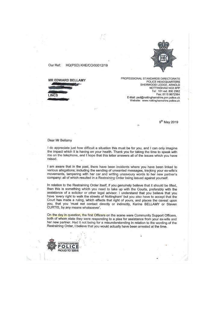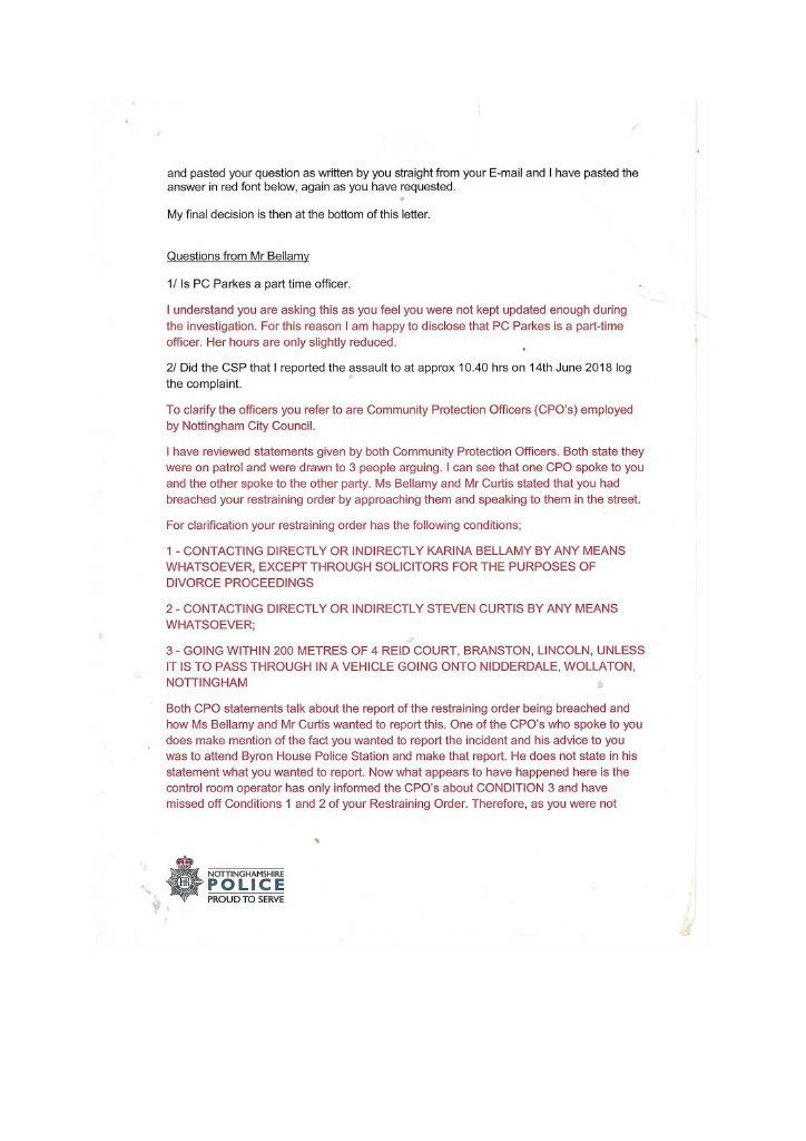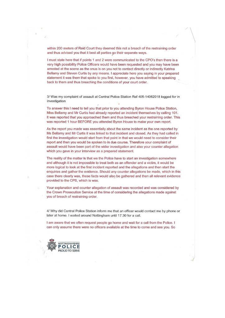This was the start of my involvement with the corrupt PC Parkes, who had been tasked. to investigate their complaint; meanwhile, I went to Nottingham Central Police Station to lodge my complaint and was given an incident number. I did not realise at the time that this piece of corrupt scum would ignore my complaint. Parkes, who had obviously decided I was Guilty, fell into the prevailing scenario in Nottinghamshire Police that women must always be believed, plus the me to trend. Karina is a brilliant actress and liar and would have played on the empathy and corrupt stupidity of Parkes. This would explain the lack of communication and investigation by PC Parkes even though I offered to travel to Nottingham for an interview.