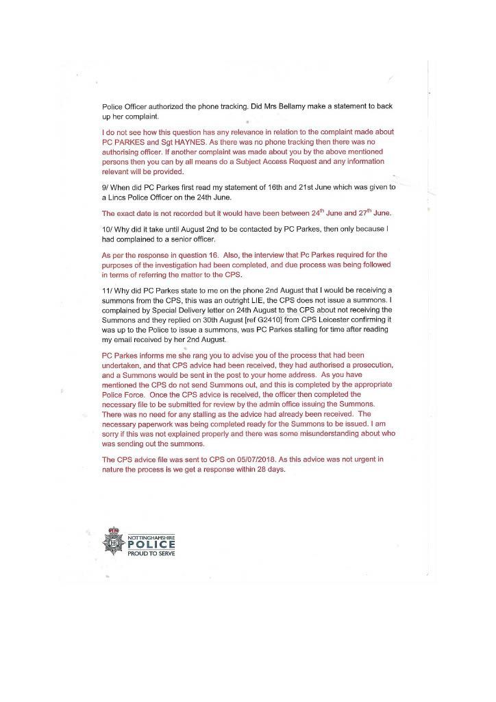 After handing my statement to the Lincolnshire police officer on 24 June, who informed me PC Parkes was the investing officer, I phoned Notts police to speak to PC Parkes on 26 June, only to be told she was on nights and then would be on rest days; no offer was made to take a message or to get her to contact me. This was a pure obstruction as this biased woman did not want to investigate my complaint.