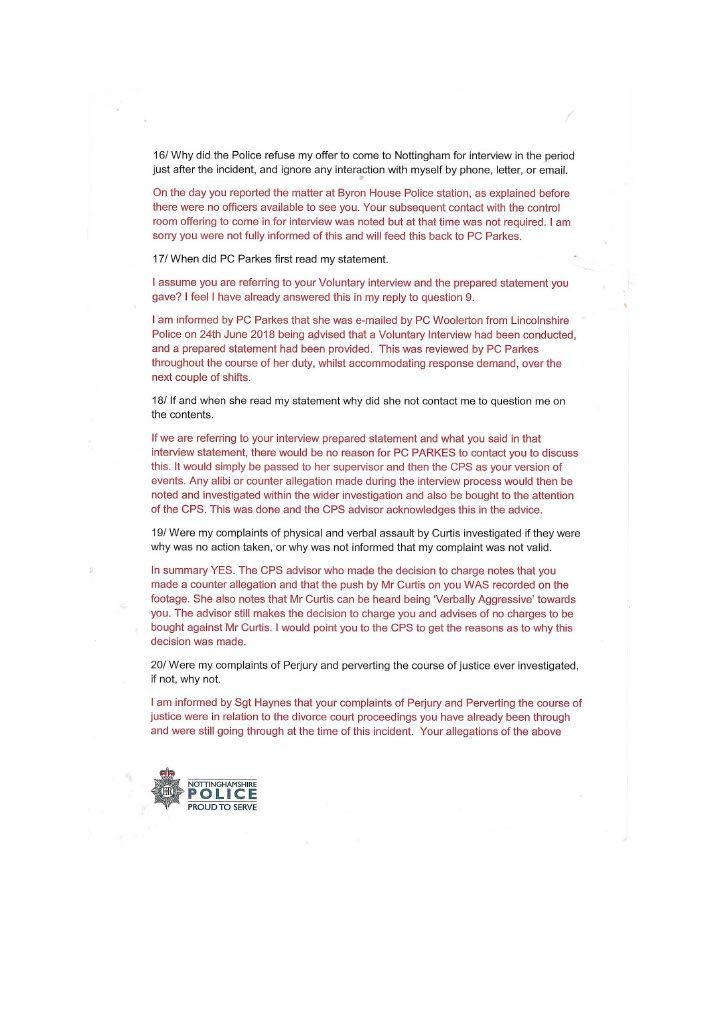 On the day of the incident, Thursday 14th, I reported the incident to Nottingham Central Police Station at approximately 11 a.m. I complained that Curtis had physically and verbally assaulted me and was given Incident Number 405-14062018. I waited about 20 minutes for a Police Officer to interview me but was told no one was available. Still, an officer would contact me later in the day [I was in Nottingham all day], or Lincolnshire Police would contact me at home, I left my mobile and home phone numbers.