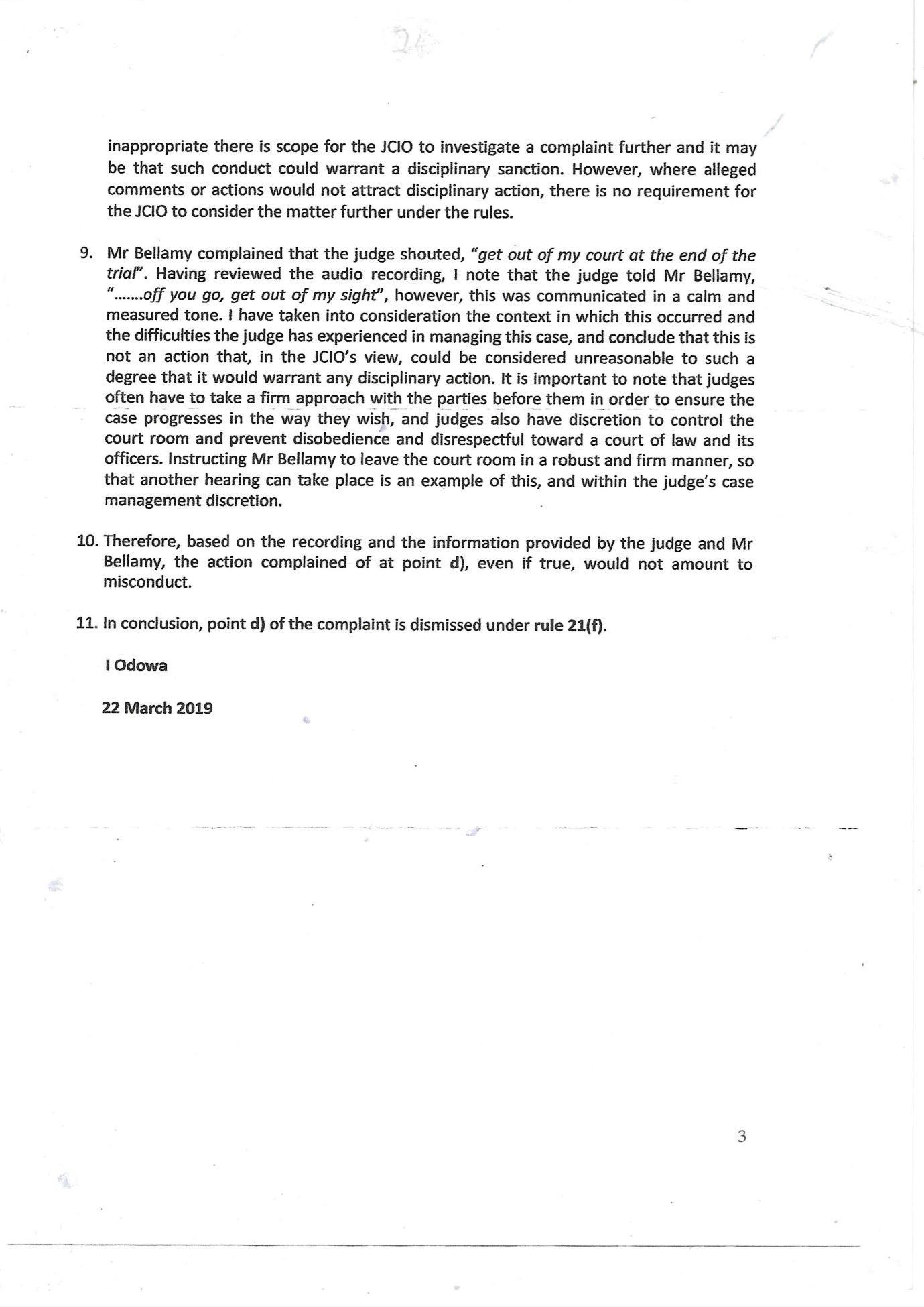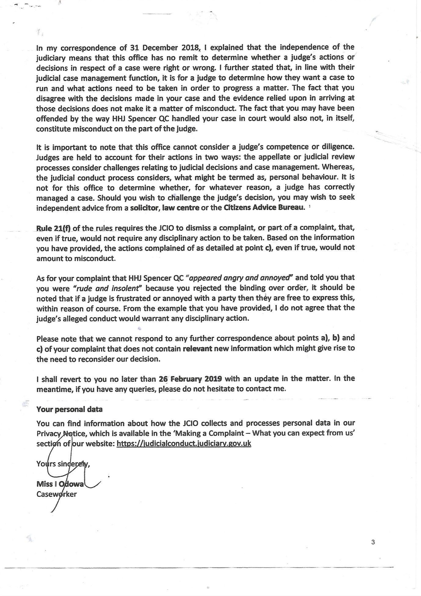 Dear Miss Odowa, in response to your letter of 31st December 20181 will try to recan the precise sequence of what was a very short trial, split into two parts by a recess. I spoke very little during the trail and was shocked and upset to be accused of being rude and insolent, which I find hard to understand,