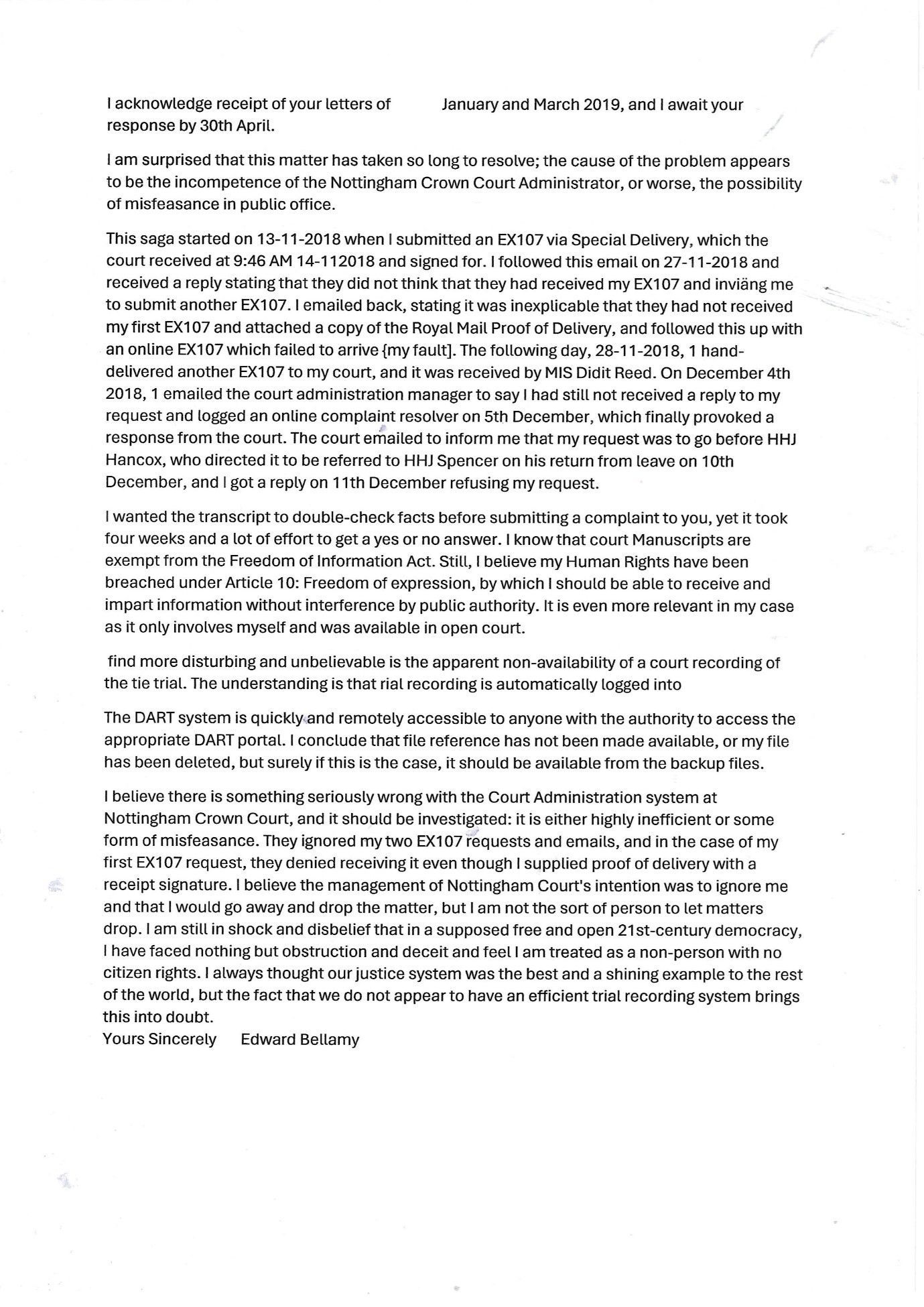 The real criminals in Nottingham Crown Court are not standing in the Dock; they are the judges, lawyers, court managers, and their staff. There is so much for British justice, more like North Korea or Iran. I next submitted a letter of complaint about the Judge to the Judicial Conduct and Investigation Office., which is based at the Royal Court Of Justice. I received a prompt acknowledgement, and more details were requested. After three months of back-and-forth correspondence, I pointed out that the trial should have been recorded on the new National court record system, DART. They said they would request a copy four months after the start of my complaint; surely this should have been done at the start of the investigation and not have to be prompted by me. They came back and stated that they had only recovered part of the. Part of the recording and nothing untoward was heard; this is supposed to be a state-the-art national computer justice record system that costs hundreds of millions of dollars. I do not believe them, it’s a cover-up and lies. They suggested that I engage a Solicitor and appeal. They also stated that Judges can say and do as they please. They know how to put down peasants like me without money to pursue the matter. I HAVE ONE THING FROM THIS SAGA: WE LIVE IN AN EXTREMELY CORRUPT COUNTRY WITH A DISGRACEFUL LEGAL SYSTEM CORRUPT FROM CLERKS TO THE HIGH COURT.