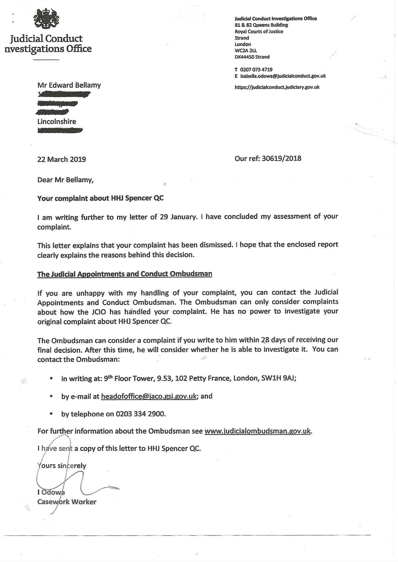 Thank you for your letter of 22nd March concluding your investigation into my complaint. I disagree with your conclusions, but I did not expect a clear and honest assessment of my complaint. I have to accept that we have a far from perfect legal system, one which is shrouded in secrecy and protection of the practitioners.