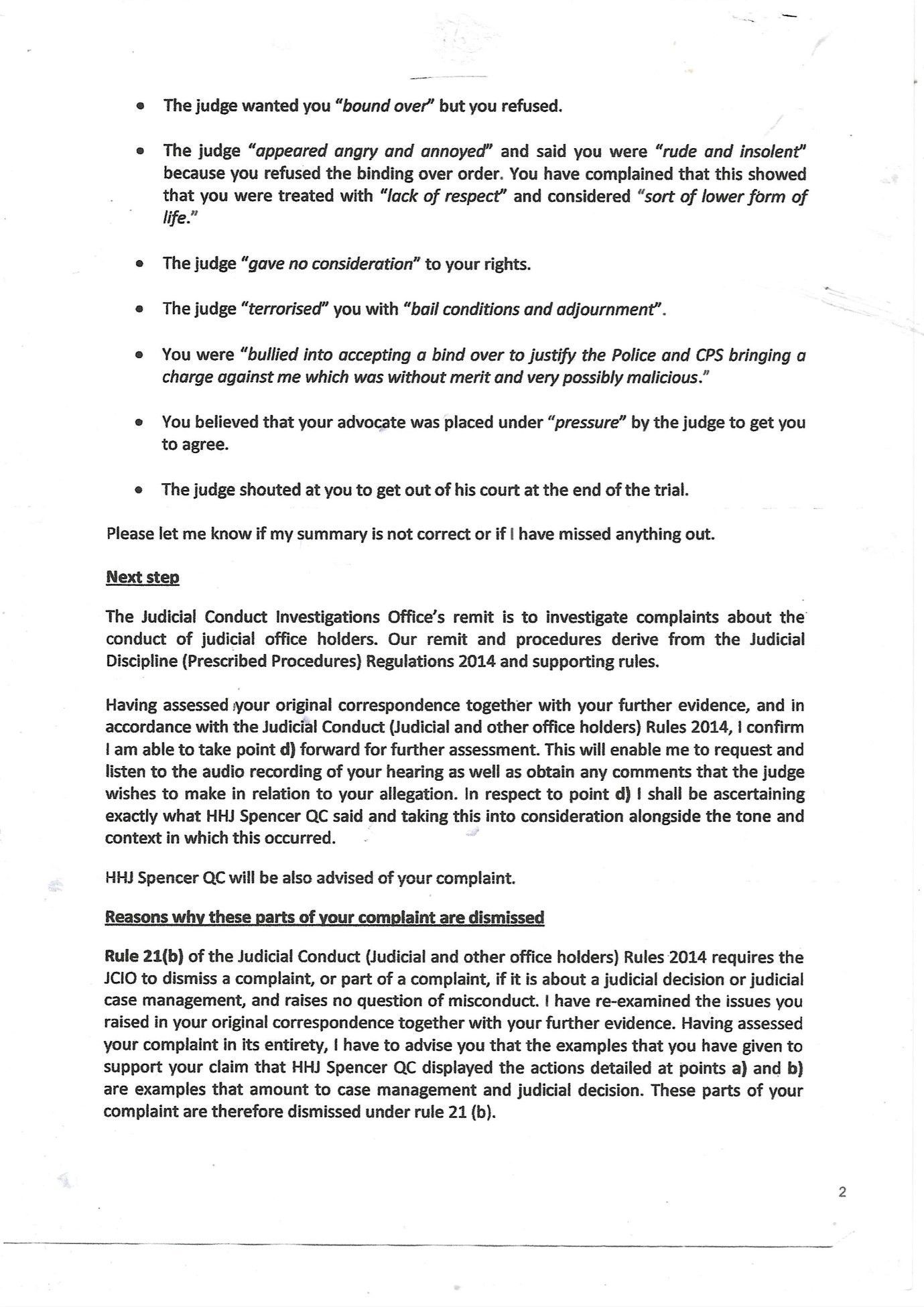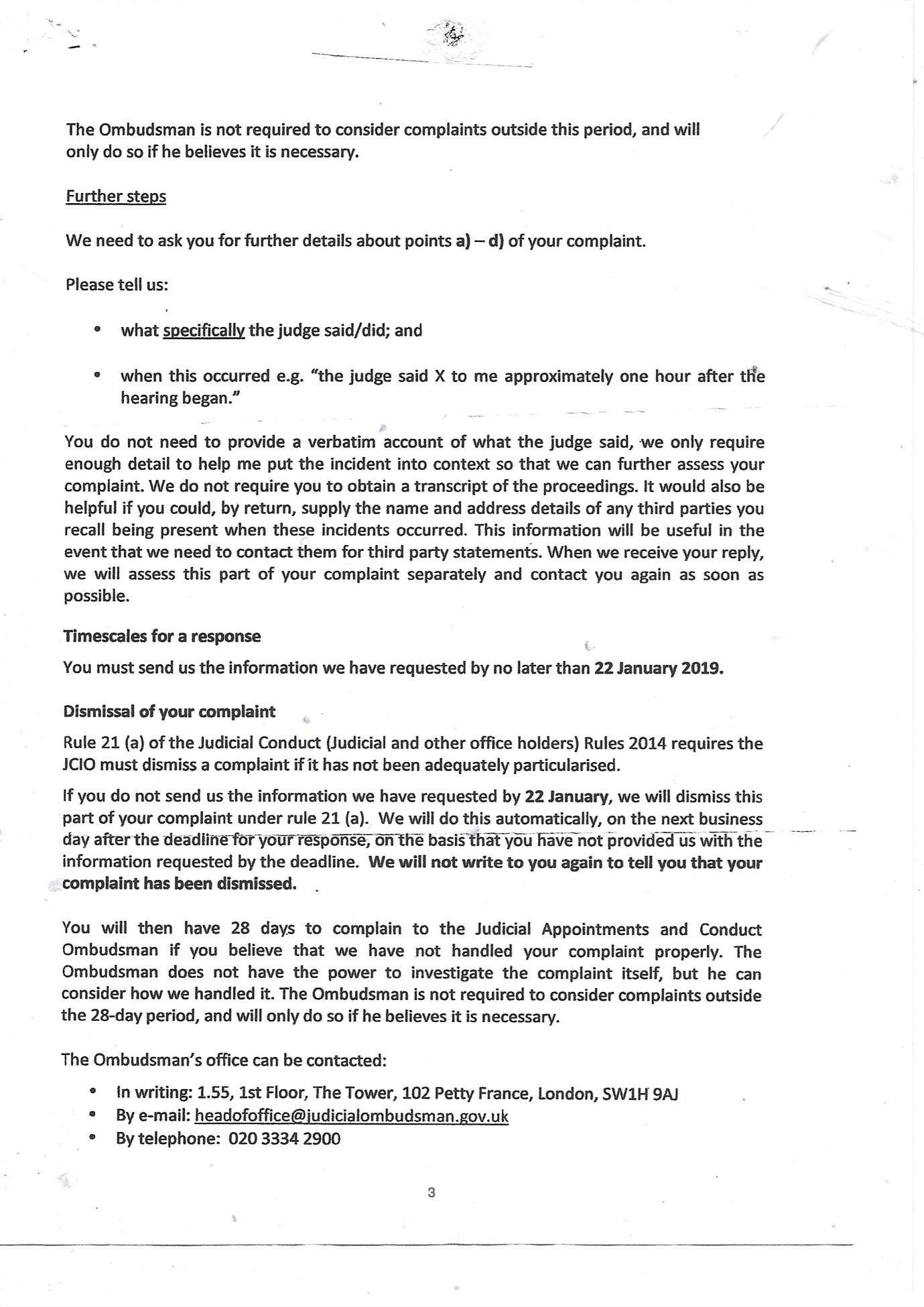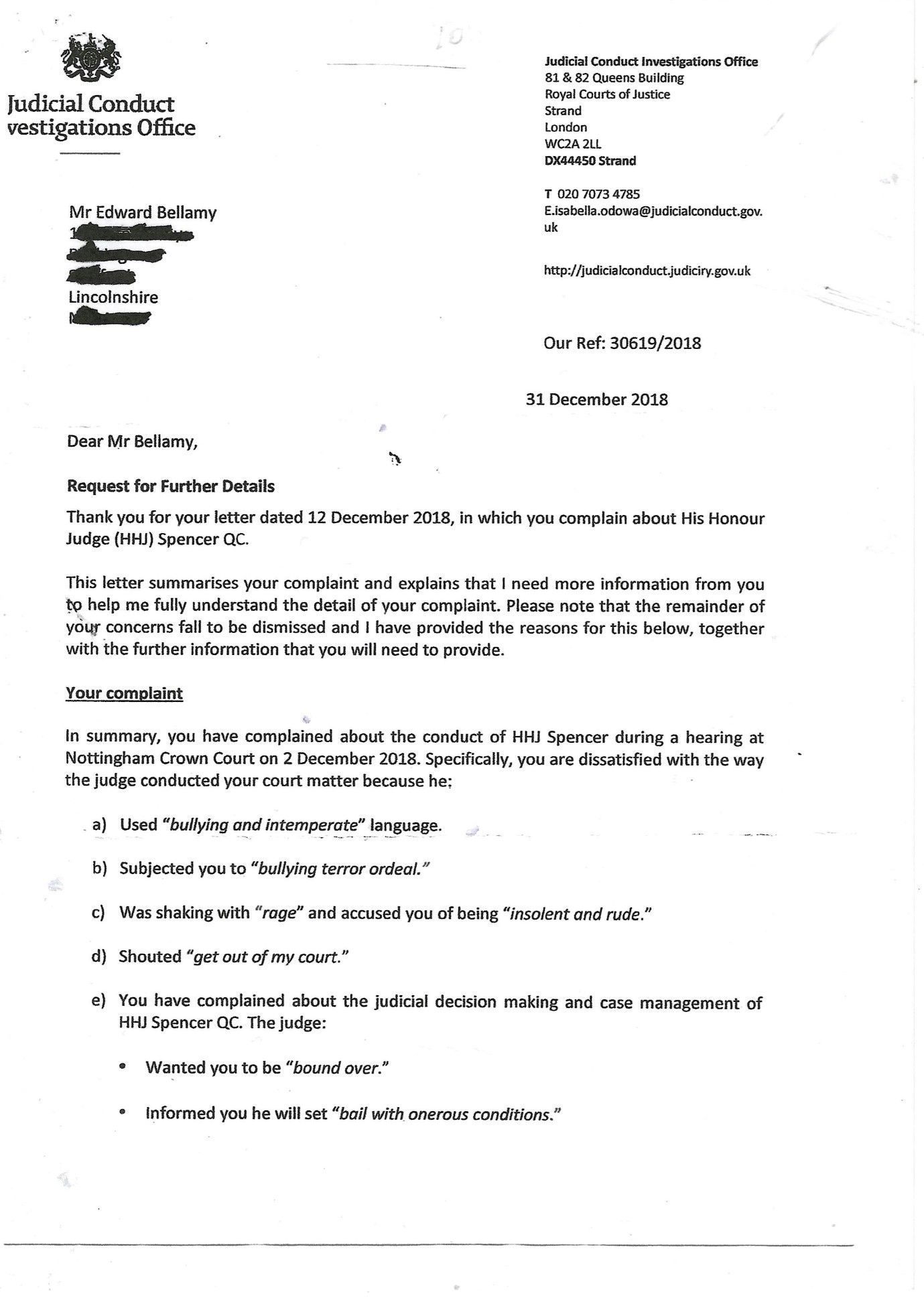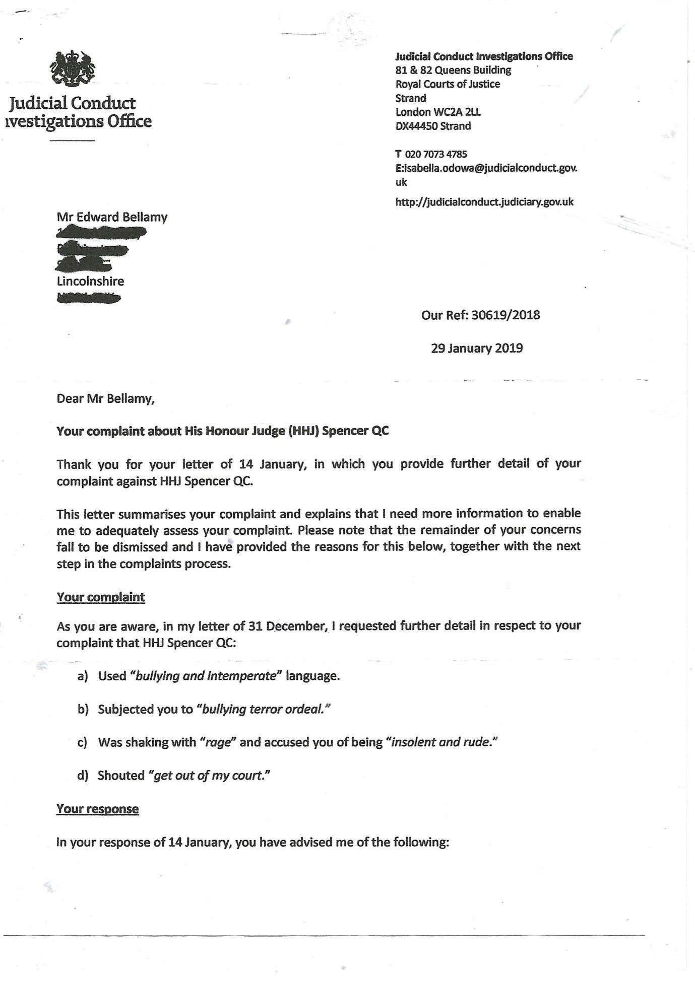 Dear Miss Odowa, in response to your letter of 31st December 20181 will try to recan the precise sequence of what was a very short trial, split into two parts by a recess. I spoke very little during the trail and was shocked and upset to be accused of being rude and insolent, which I find hard to understand,