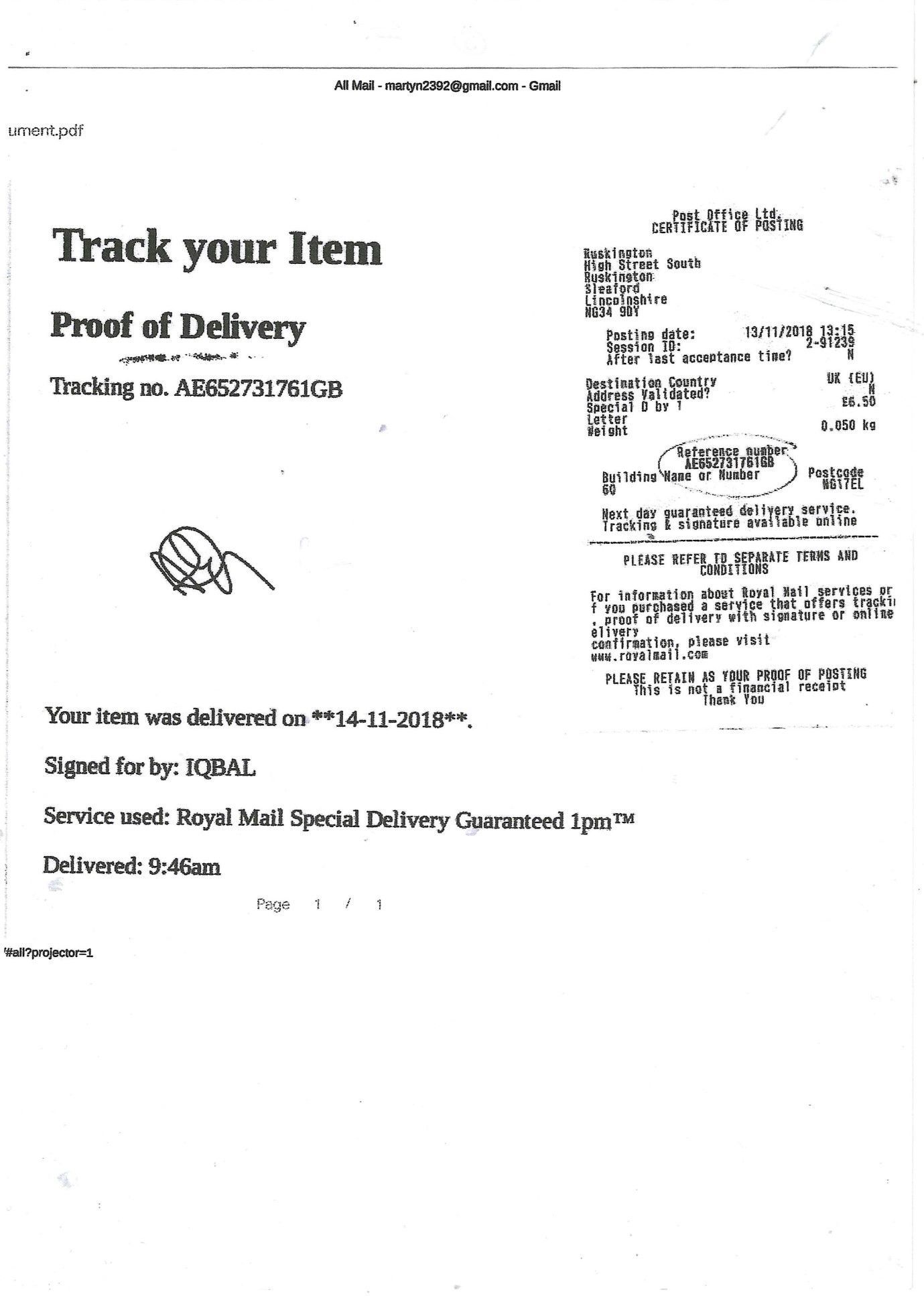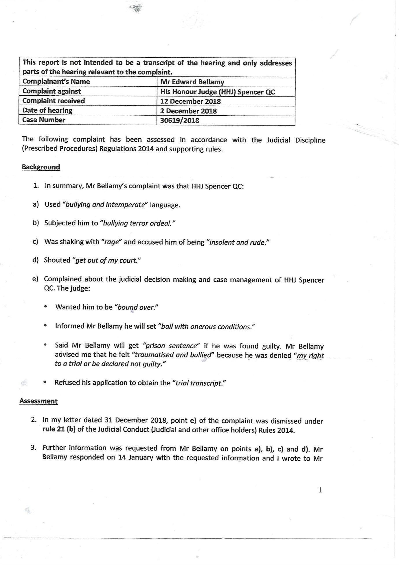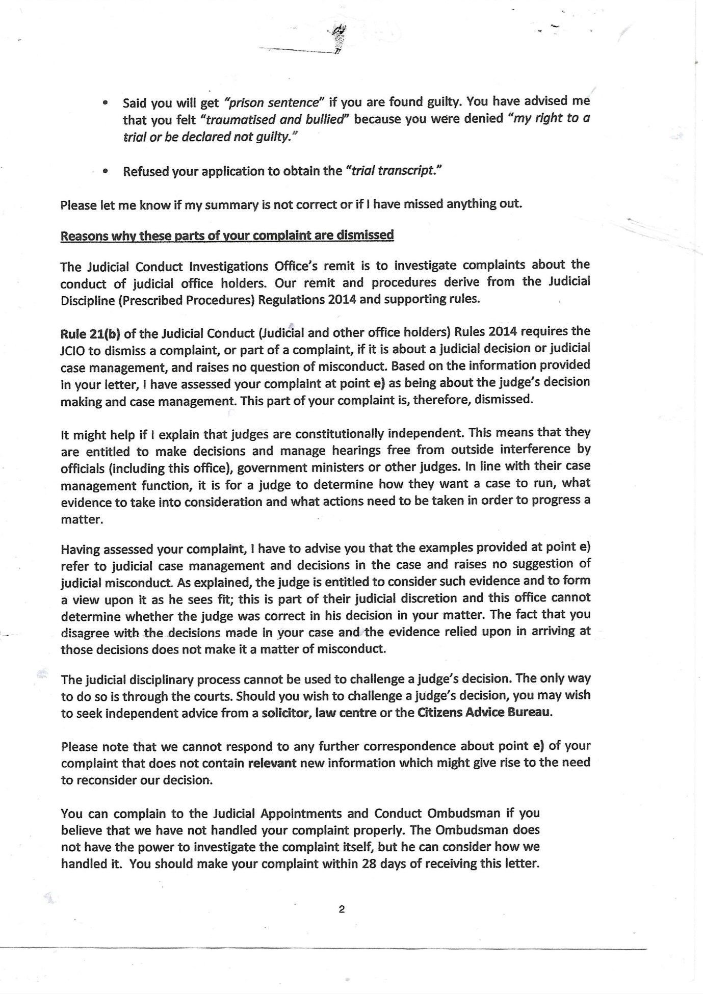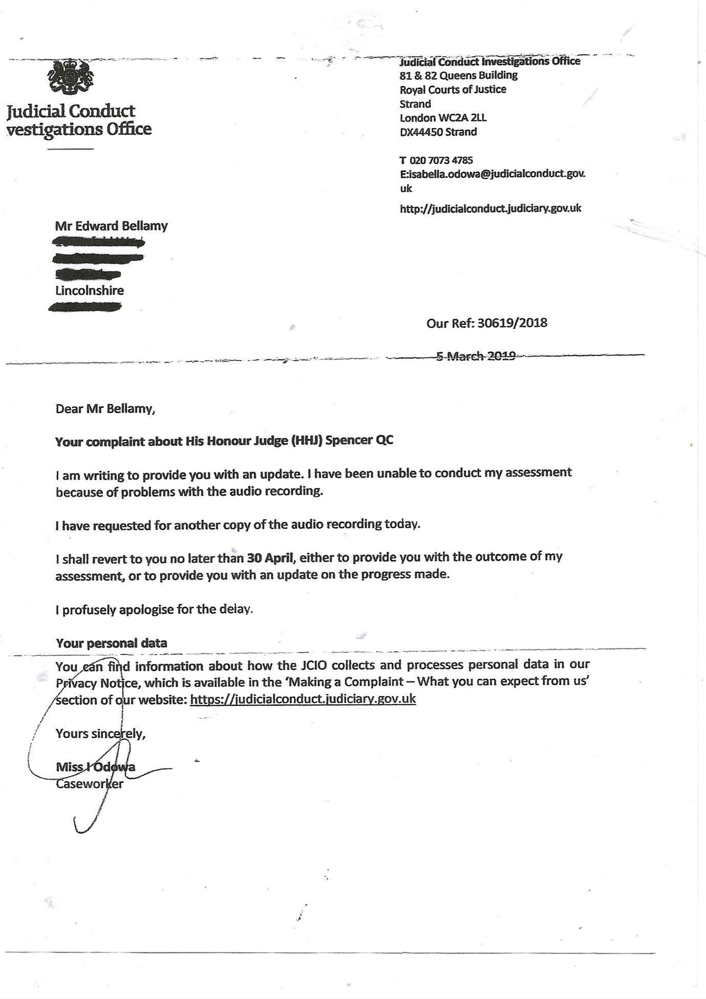 Dear Miss Odowa, in response to your letter of 31st December 20181 will try to recan the precise sequence of what was a very short trial, split into two parts by a recess. I spoke very little during the trail and was shocked and upset to be accused of being rude and insolent, which I find hard to understand,