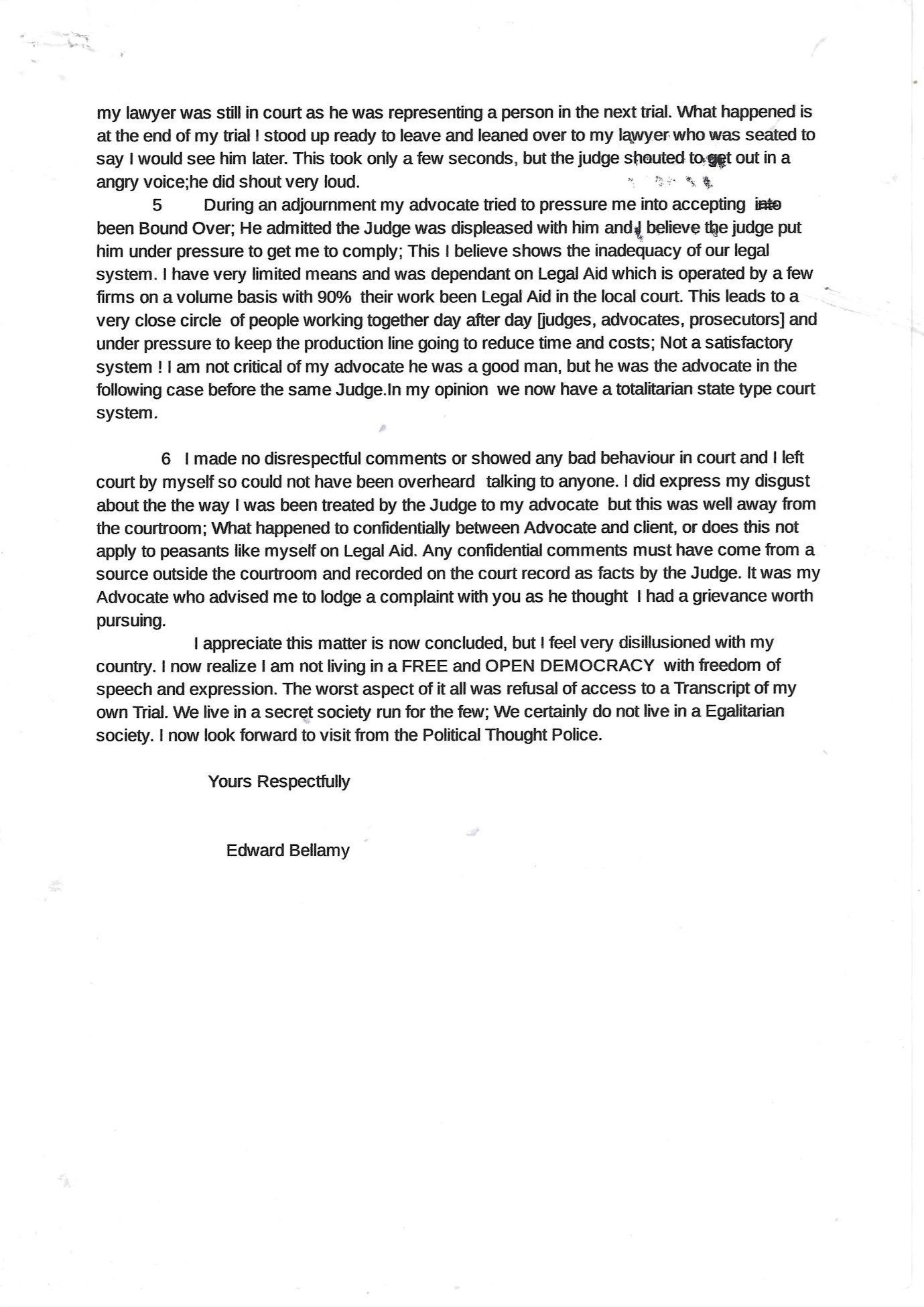Advocate until I was released from the dock when the judge left the court. I told my advocate I was not accepting being Bound Over as I was Not Guilty and had done no wrong; he then said he would tell the Judge but came back 2 minutes later saying he could not find the Judge. I believe he was terrified of the Judge and intended to tell the Judge of my refusal to be Bound Over.